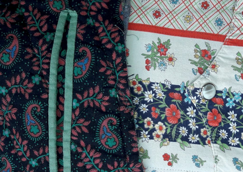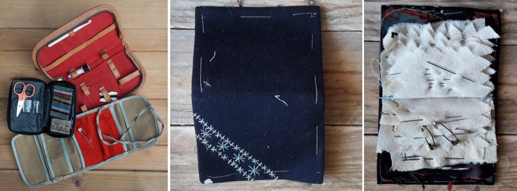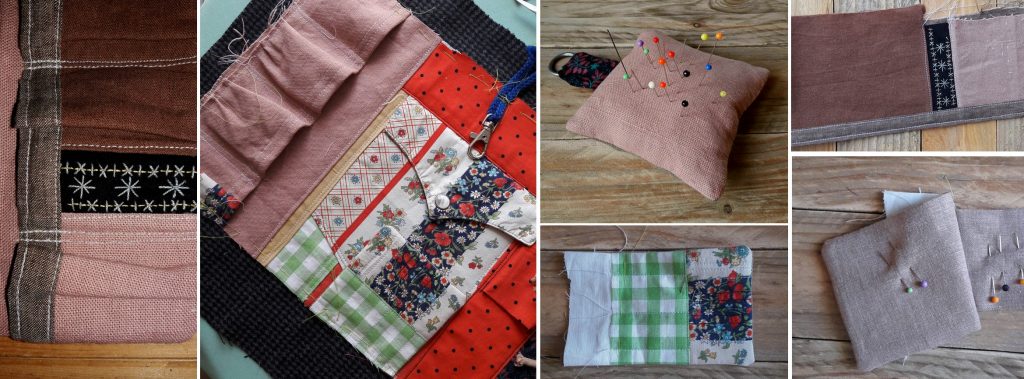 Et j’ai « construit » la trousse autour des deux poches, en créant avec des bouts de tissus différents pochettes, rabats, brides, coussinet à épingles …, sans oublier d’inclure la petite broderie au point de croix présente sur un de mes modèles, et réalisée par ma maman.